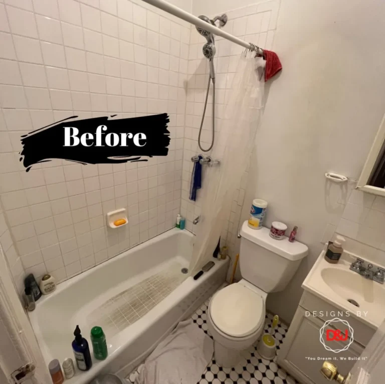 Before After Outdated bathroom before remodeling project in New Jersey by Designs by D and J.Stylish bathroom renovation with new tiles and fixtures completed by expert remodelers in NJ.