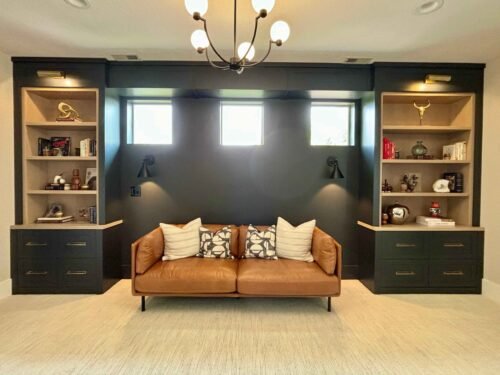 Basement remodeling and renovation with cozy seating area and bright lighting by Designs by D and J.